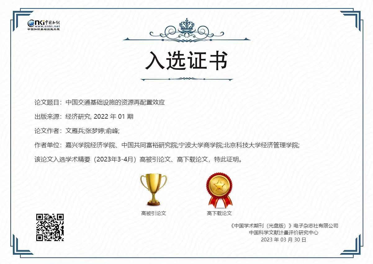 文雁兵教授、宁波大学商学院张梦婷副教授、北京科技大学经济管理学院俞峰博士的合作论文《中国交通基础设施的资源再配置效应》(《经济研究》2022年第1期)同时入选中国知网学术精要数据库(2023年3-4月)高被引论文和高下载论文。目前已被《管理世界》等期刊论文引用9次,下载9700余次。