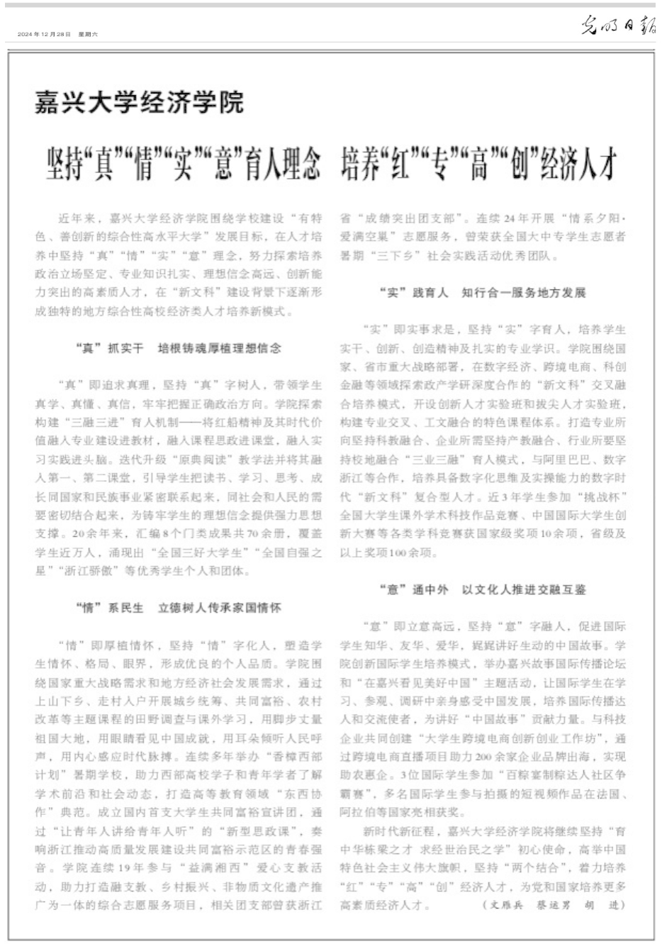 宣传介绍学院人才培养模式的文章《坚持“真”“情”“实”“意”育人理念 培养“红”“专”“高”“创”经济人才》。