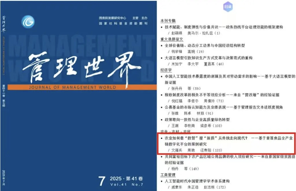 文雁兵教授、周艳副教授与汪寿阳教授(中国科学院大学经济与管理学院、上海科技大学创业与管理学院)合作论文《农业如何借“数智”提“新质”从传统走向现代?——基于青莲食品全产业链数字化平台的案例研究》在权威期刊《管理世界》2025年7月刊正式发表。文雁兵教授为论文第一作者,周艳副教授为论文通讯作者,520自拍