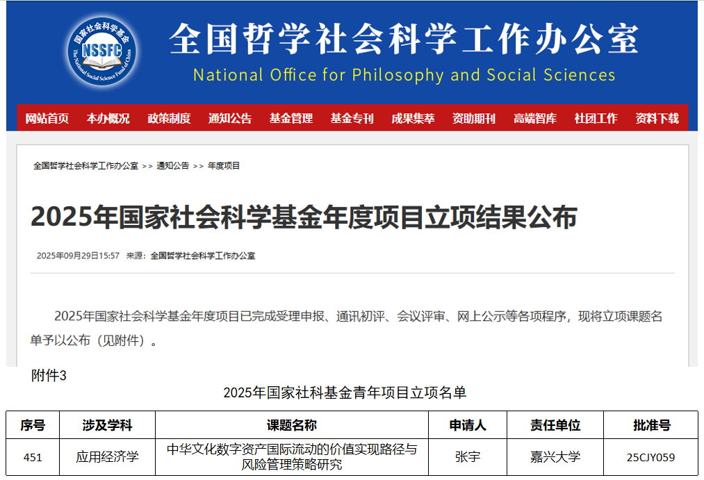 张宇博士主持申报的青年项目《中华文化数字资产国际流动的价值实现路径与风险管理策略研究》(25CJY059)获批立项资助。