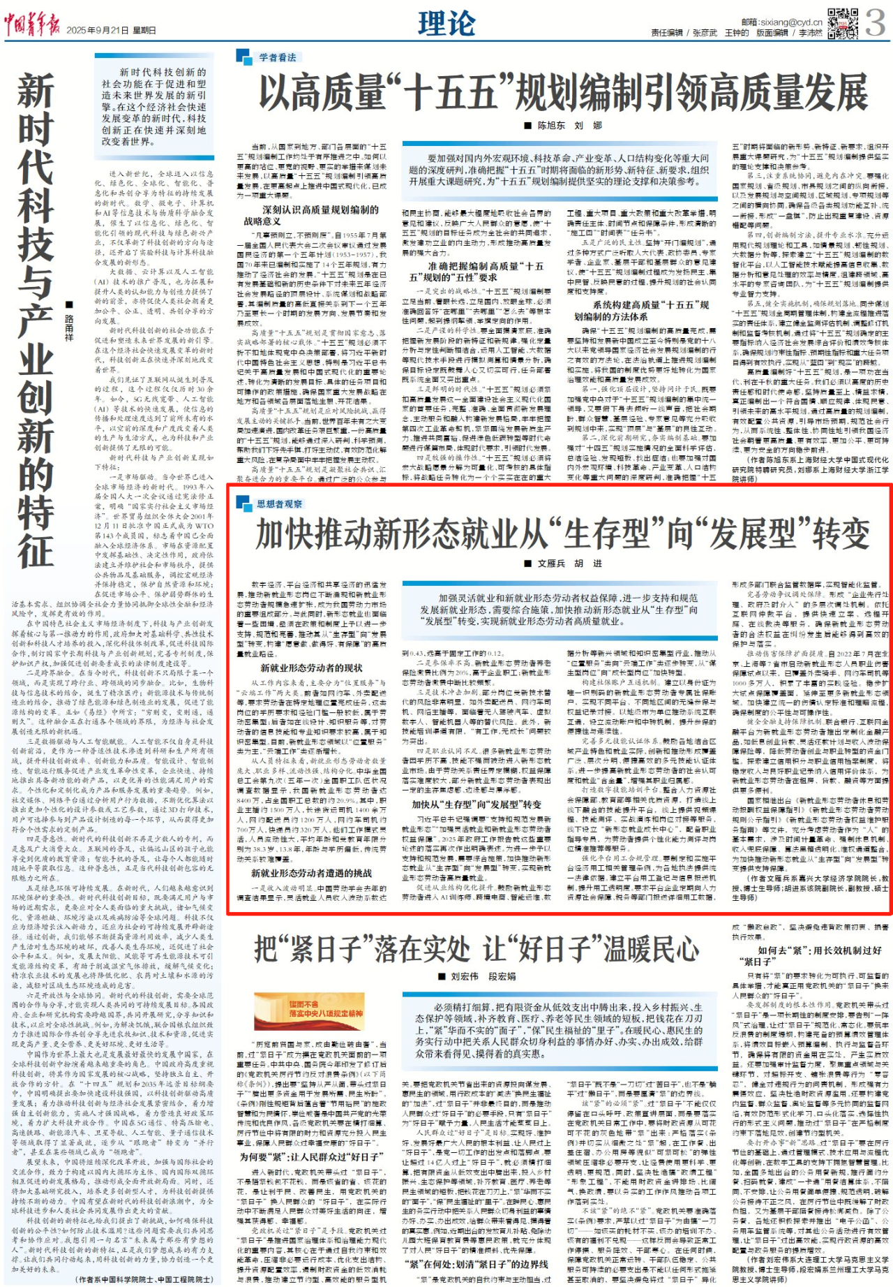 文雁兵教授、胡进副教授在《中国青年报》理论版发表文章《加快推动新形态就业从“生存型”向“发展型”转变》。文章指出,加强灵活就业和新就业形态劳动者权益保障,进一步支持和规范发展新就业形态,需要综合施策,加快推动新形态就业从“生存型”向“发展型”转变,实现新就业形态劳动者高质量就业。