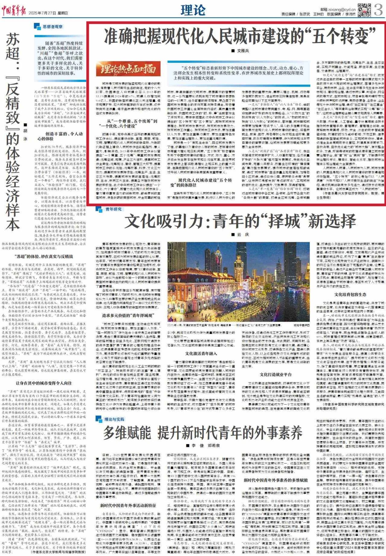 文雁兵教授在《中国青年报》理论版发表文章《准确把握现代化人民城市建设的“五个转变”》。他指出,“五个转变”标志着新形势下中国城市建设的理念、方式、动力、重心、方法将会发生根本性转变和系统性变革,在世界城市发展史上都将取得理论上和实践上的重大突破。