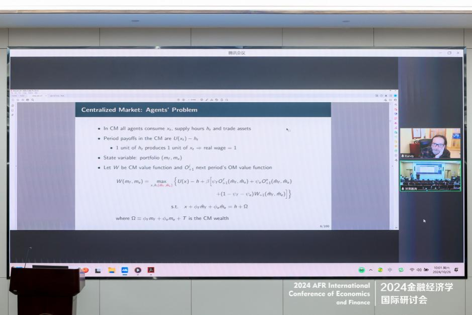 世界计量经济学会院士、威斯康星大学麦迪逊分校讲席教授Randall Wright做“E-Money and Liquidity”主题演讲。他的文章构建了一个框架来分析电子货币在何种条件下因其直接或间接流动性而被赋予价值。间接流动性是指电子货币本身非支付工具但可用于交易以换取支付工具。理论上,推导出无内在价值的电子货币被赋予价值的条件,这取决于其属性及与中央银行或商业银行发行货币的比较。在动态均衡中,电子货币的价值波动可源于自我实现的预言。基于解析和数值结果,文章讨论了包括利率或法定货币增长率挂钩的政策方案,并探讨了电子货币作为应对通胀或金融不稳定的对冲工具。文章在深化对电子货币、流动性及去中心化交易的理解方面做出了重要贡献。