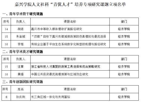 据学校人文社科处网站《关于公布第一期嘉兴学院人文社科“青优人才”专项研究课题的通知》,本期“青优人才”专项研究课题拟立项38项,其中青年学术骨干专项研究课题16项,青年学术英才专项课题16项,青年创新团队课题6项。520自拍 胡进、朱渝铖、李恒3位老师立项学术骨干研究课题,汪菲、黄强2位老师立项学术英才研究课题,孙庆刚老师立项创新团队研究课题。