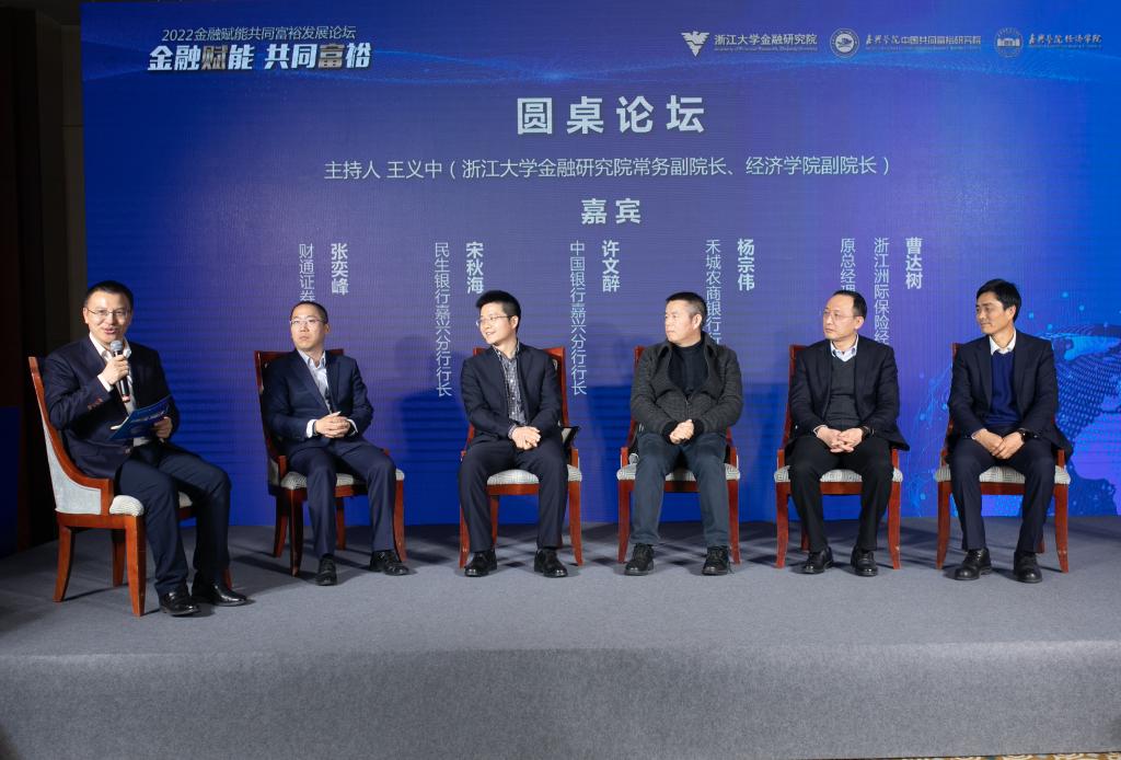 论坛圆桌论坛环节,浙江洲际保险经纪有限公司原总经理曹达树,禾城农商银行行长杨宗伟,中国银行嘉兴分行行长许文醉,民生银行嘉兴分行行长宋秋海,财通证券嘉兴分公司总经理张奕峰5位业界大咖分享了精彩观点。大咖们认为,行业赋能共同富裕要推动经济高质量发展,深化行业供给侧和需求侧改革,要创新金融产品和服务,满足民营企业发展和居民财富增长的需要。圆桌论坛由浙江大学金融研究院常务副院长、520自拍