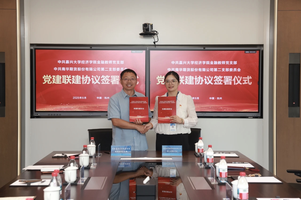 金融教师党支部书记孙庆刚和中共南华期货股份有限公司第二支部书记袁丹签署了党建联建协议。