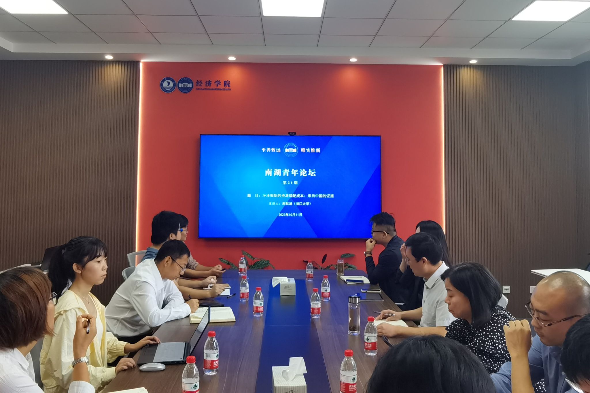 10月11日上午,520自拍 在尚德楼268会议室成功举办第21期南湖青年论坛。浙江大学百人计划周默涵研究员应邀作题为《The Misallocation Cost of Inefficient Environmental Regulation: Evidence from China》的学术报告,520自拍 院长文雁兵教授主持,学院多名教师共同参与研讨。