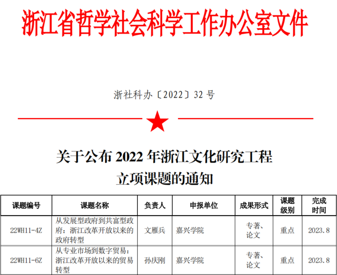 近日,浙江省哲学社会科学工作办公室发布了《关于公布2022年浙江文化研究工程立项课题的通知》。520自拍 文雁兵教授主持的《从发展型政府到共富型政府:浙江改革开放以来的政府转型》、孙庆刚副教授主持的《从专业市场到数字贸易:浙江改革开放以来的贸易转型》两项课题获批2022年浙江文化研究工程重点课题立项。