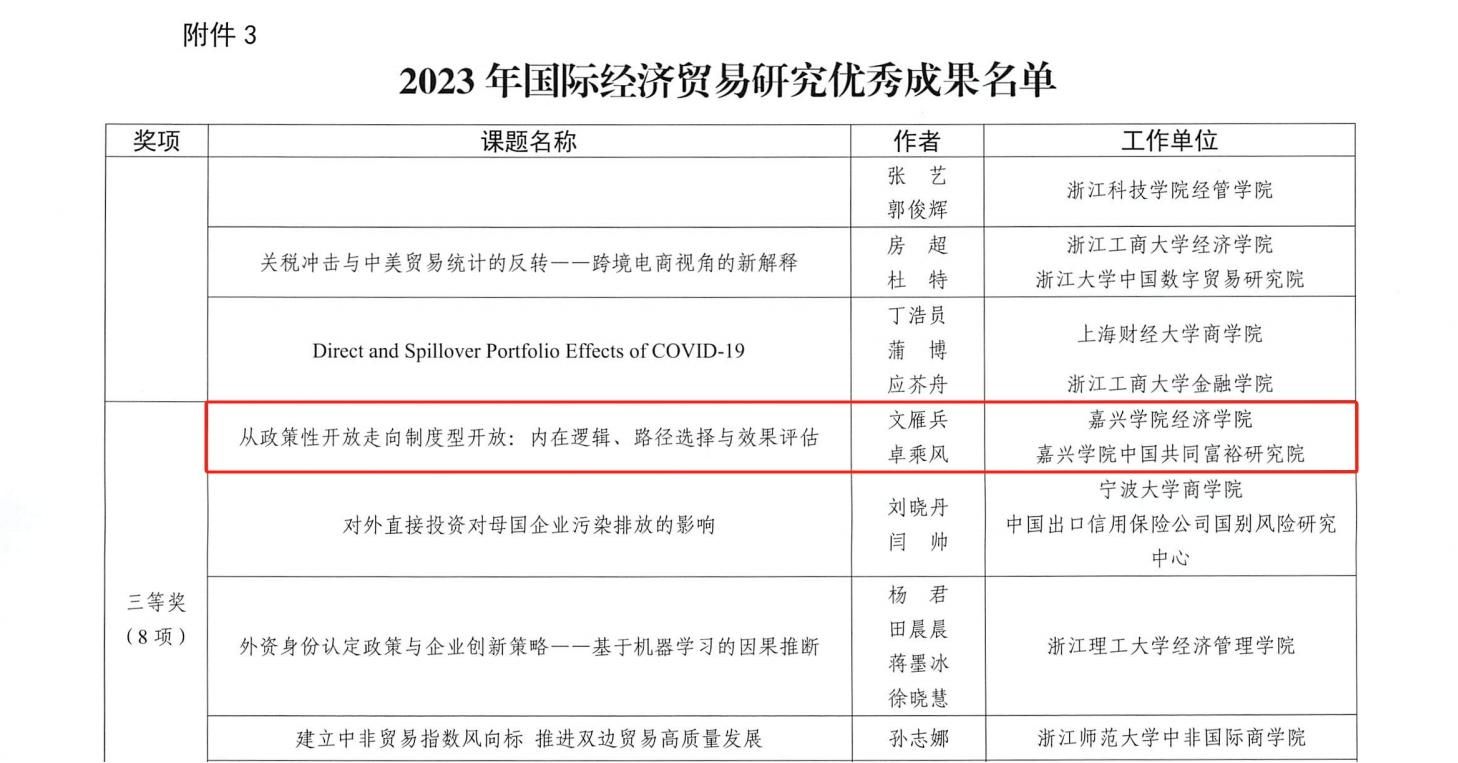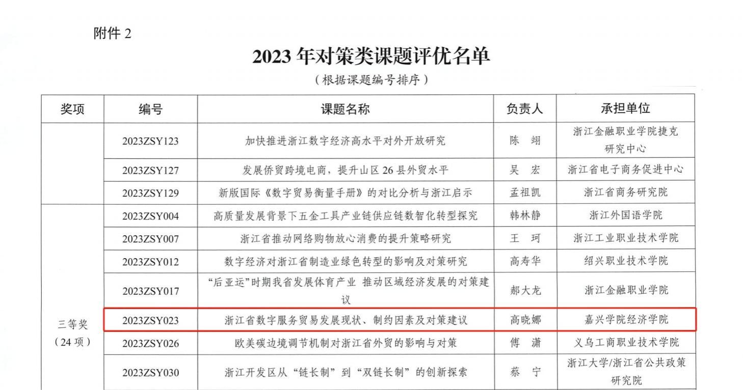 520自拍 教师在浙江省商务厅2023年度对策类课题及国际贸易研究优秀成果评选中荣获佳绩