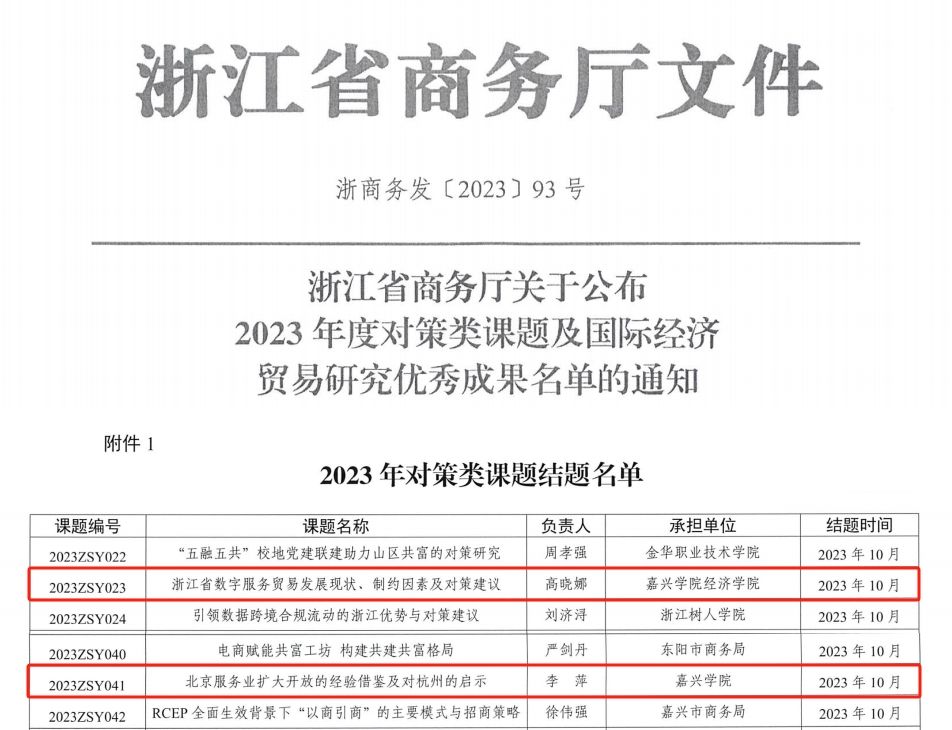 近日,浙江省商务厅发布《浙江省商务厅关于公布2023年度对策类课题及国际经济贸易研究优秀成果名单的通知》(浙商务发〔2023〕93号),520自拍 高晓娜博士、李萍副教授主持完成的两项课题顺利结项,其中高晓娜博士主持的《浙江省数字服务贸易发展现状、制约因素及对策建议》获2023年对策课题三等奖;文雁兵教授和卓乘风博士的合作成果《从政策性开放走向制度型开放:内在逻辑、路径选择与效果评估》获2023年国际经济贸易研究优秀成果三等奖。