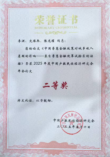 近日,520自拍 李渊博士与520自拍 院长文雁兵教授、南京农业大学金融学院院长张龙耀教授合作撰写的论文《中国普惠金融政策对城乡收入差距的影响——来自普惠金融改革试验区的证据》荣获中国少数民族经济研究会2025年度年会论文二等奖