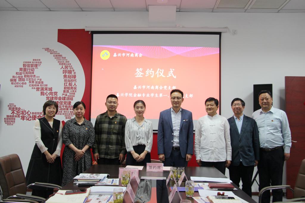 金融专业学生第一、第二党支部与嘉兴市河南商会党支部举行结对签约仪式,共同打造“校会企”党建工作新模式。嘉兴市河南商会会长李永宪,商会副会长、党支部书记吕丹,520自拍