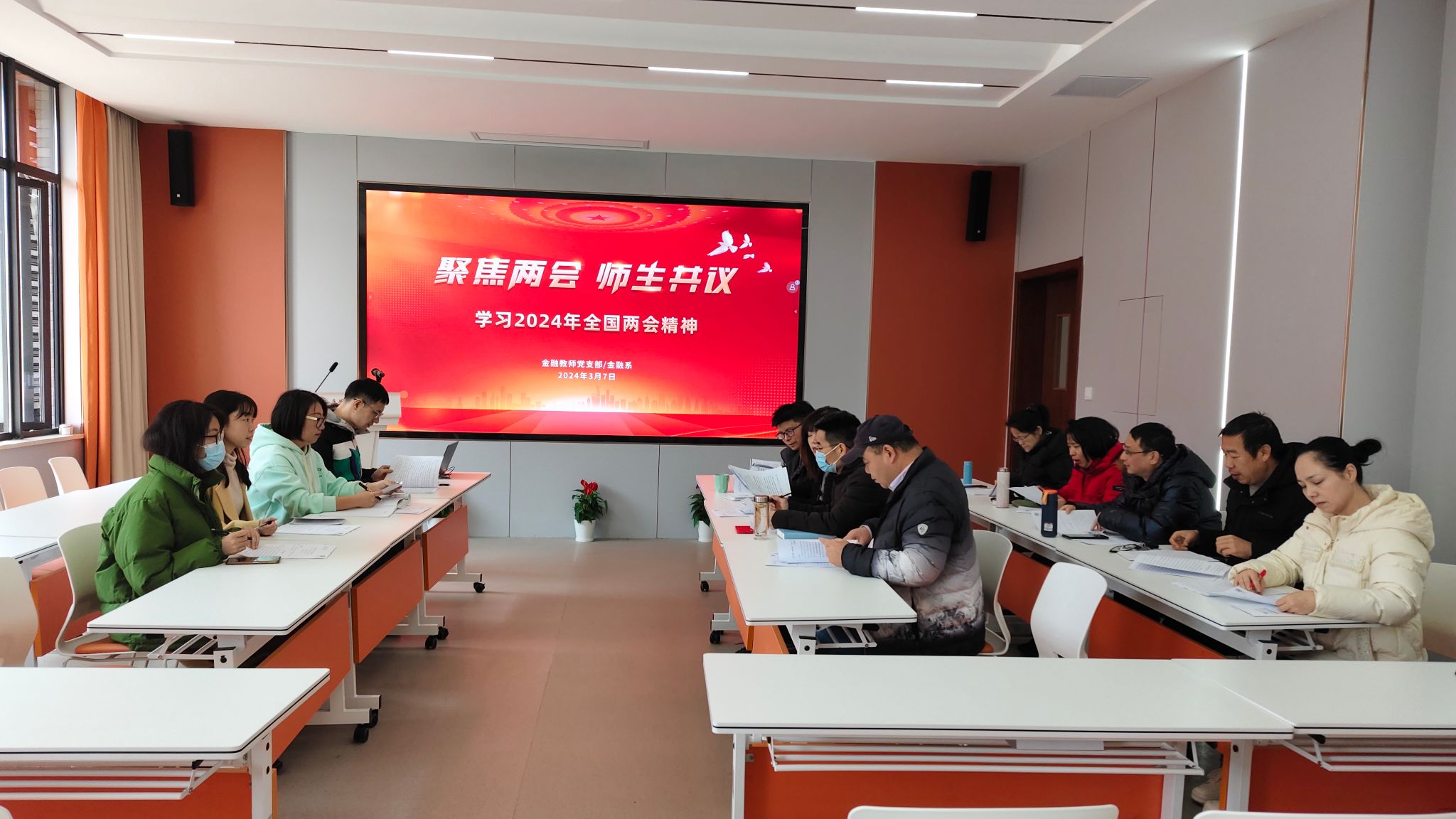 开展“聚焦两会 师生共议”专题学习交流活动,各系、党支部分别开展集体学习会。学习交流会上,大家首先原文学习《2024年政府工作报告》,围绕两会相关热点,结合自身学习、工作和生活的实际,热议两会精神。