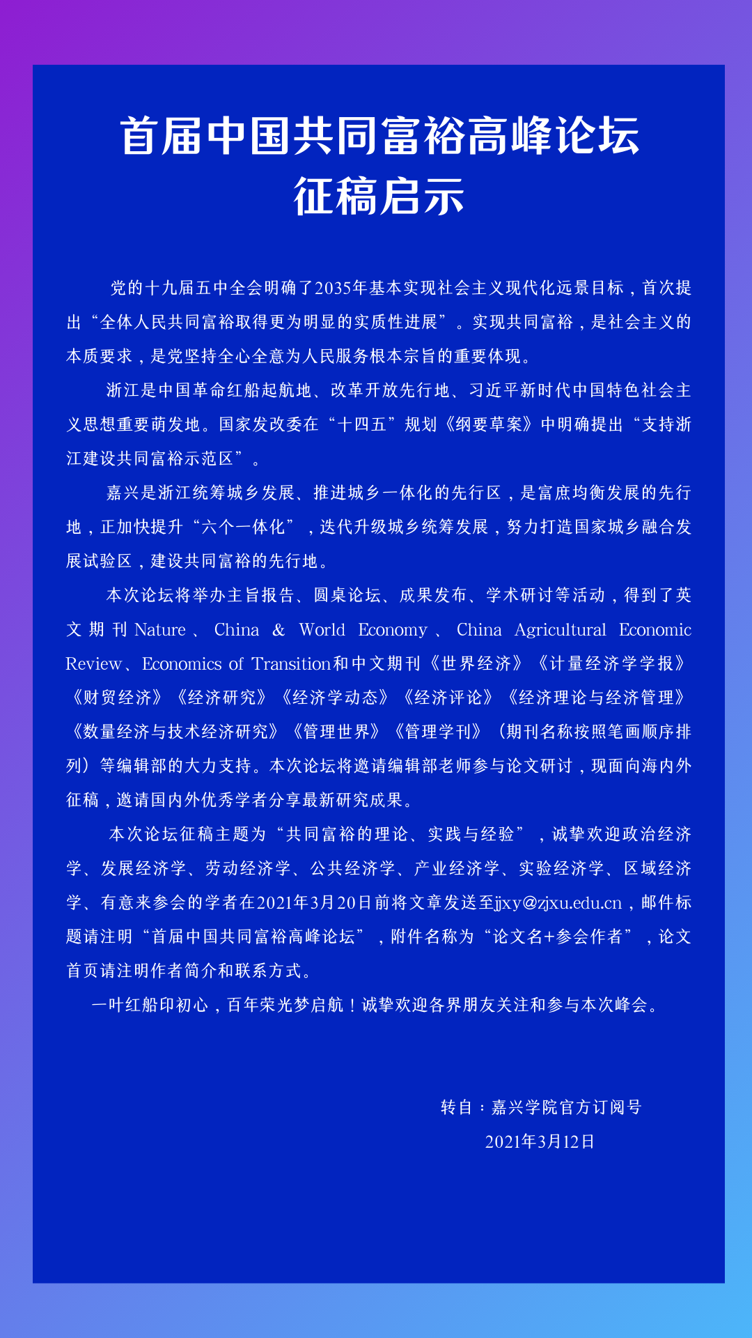 【会议通知】首届中国共同富裕高峰论坛征稿启示